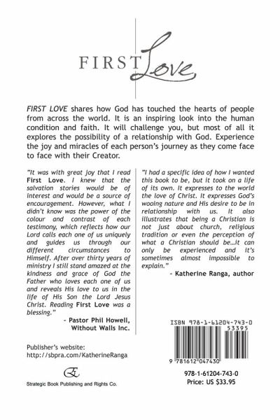 FIRST LOVE shares how God has touched the hearts of people from across the world. It is an inspiring look into the human condition and faith. It will challenge you, but most of all it explores the possibility of a relationship with God. Experience the joy and miracles of each person's journey as they come face to face with their Creator. "It was with great joy that I read First Love. I knew that the salvation stories would be of interest and would be a source of encouragement. However, what I didn't know was the power of the colour and contrast of each testimony, which reflects how our Lord calls each one of us uniquely and guides us through our different circumstances to Himself. After over thirty years of ministry I still stand amazed at the kindness and grace of God the Father who loves each one of us and reveals His love to us in the life of His Son the Lord Jesus Christ. Reading First Love was a blessing." - Pastor Phil Howell, Without Walls Inc. "I had a specific idea of how I wanted this book to be, but it took on a life of its own. It expresses to the world the love of Christ. It expresses God's wooing nature and His desire to be in relationship with us. It also illustrates that being a Christian is not just about church, religious tradition or even the perception of what a Christian should be...it can only be experienced and it's sometimes almost impossible to explain." - Katherine Ranga, author Publisher's website: http://sbpra.com/KatherineRanga