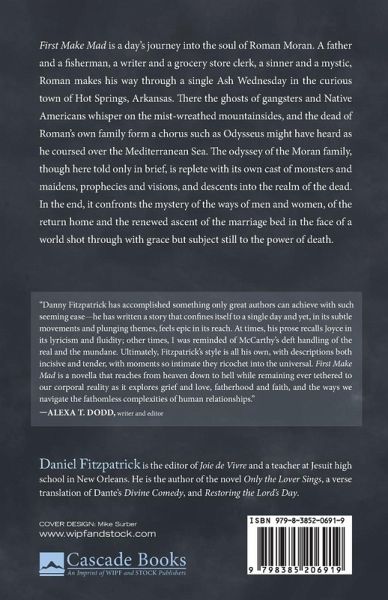 First Make Mad is a day's journey into the soul of Roman Moran. A father and a fisherman, a writer and a grocery store clerk, a sinner and a mystic, Roman makes his way through a single Ash Wednesday in the curious town of Hot Springs, Arkansas. There the ghosts of gangsters and Native Americans whisper on the mist-wreathed mountainsides, and the dead of Roman's own family form a chorus such as Odysseus might have heard as he coursed over the Mediterranean Sea. The odyssey of the Moran family, though here told only in brief, is replete with its own cast of monsters and maidens, prophecies and visions, and descents into the realm of the dead. In the end, it confronts the mystery of the ways of men and women, of the return home and the renewed ascent of the marriage bed in the face of a world shot through with grace but subject still to the power of death.