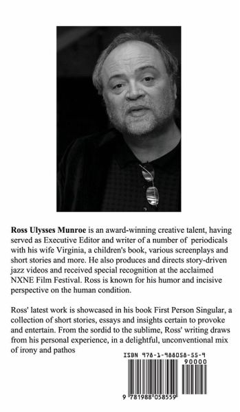 There are the little events in life. And there are the significant events in life. Individually, they all seem to have their place. But what happens when we take them together as one? A unified picture begins to emerge, much like an impressionist painting, a mandala, a lenticular image, an autostereogram, yielding up an underlying theme that sews one's experiences into a deeper narrative, rendering a profile of the myths we are living out. It is the Rorschach analysis of our souls. And it has no name. Ross Ulysses Munroe is an award-winning creative talent, having served as Executive Editor and writer of a number of periodicals with his wife Virginia, plus a children's book, various screenplays and short stories and more. He also produces and directs story-driven jazz videos and has received special recognition at the acclaimed NXNE Film Festival. Ross is known for his humor and incisive perspective on the human condition. Ross' latest work is showcased in his book First Person Singular, a collection of short stories, essays and insights certain to provoke and entertain. From the sordid to the sublime, Ross' writing is drawn from his personal experience, in a delightful and unconventional mix of irony and pathos.
