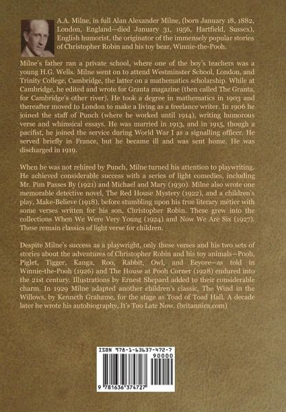 CONTENTS INTRODUCTION WURTZEL-FLUMMERY THE LUCKY ONE THE BOY COMES HOME BELINDA THE RED FEATHERS A.A. Milne, in full Alan Alexander Milne, (born January 18, 1882, London, England-died January 31, 1956, Hartfield, Sussex), English humorist, the originator of the immensely popular stories of Christopher Robin and his toy bear, Winnie-the-Pooh. Milne's father ran a private school, where one of the boy's teachers was a young H.G. Wells. Milne went on to attend Westminster School, London, and Trinity College, Cambridge, the latter on a mathematics scholarship. While at Cambridge, he edited and wrote for Granta magazine (then called The Granta, for Cambridge's other river). He took a degree in mathematics in 1903 and thereafter moved to London to make a living as a freelance writer. In 1906 he joined the staff of Punch (where he worked until 1914), writing humorous verse and whimsical essays. He was married in 1913, and in 1915, though a pacifist, he joined the service during World War I as a signalling officer. He served briefly in France, but he became ill and was sent home. He was discharged in 1919. When he was not rehired by Punch, Milne turned his attention to playwriting. He achieved considerable success with a series of light comedies, including Mr. Pim Passes By (1921) and Michael and Mary (1930). Milne also wrote one memorable detective novel, The Red House Mystery (1922), and a children's play, Make-Believe (1918), before stumbling upon his true literary métier with some verses written for his son, Christopher Robin. These grew into the collections When We Were Very Young (1924) and Now We Are Six (1927). These remain classics of light verse for children. Despite Milne's success as a playwright, only these verses and his two sets of stories about the adventures of Christopher Robin and his toy animals-Pooh, Piglet, Tigger, Kanga, Roo, Rabbit, Owl, and Eeyore-as told in Winnie-the-Pooh (1926) and The House at Pooh Corner (1928) endured into the 21st century. Illustrations by Ernest Shepard added to their considerable charm. In 1929 Milne adapted another children's classic, The Wind in the Willows, by Kenneth Grahame, for the stage as Toad of Toad Hall. A decade later he wrote his autobiography, It's Too Late Now. (britannica.com)