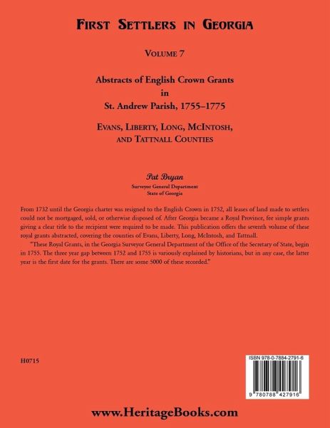 From 1732 until the Georgia charter was resigned to the English Crown in 1752, all leases of land made to settlers could not be mortgaged, sold, or otherwise disposed of. After Georgia became a Royal Province, fee simple grants giving a clear title to the recipient were required to be made. This publication offers the seventh volume of these royal grants abstracted, covering the counties of Evans, Liberty, Long, McIntosh, and Tattnall. "These Royal Grants, in the Georgia Surveyor General Department of the Office of the Secretary of State, begin in 1755. The three year gap between 1752 and 1755 is variously explained by historians, but in any case, the latter year is the first date for the grants. There are some 5000 of these recorded."