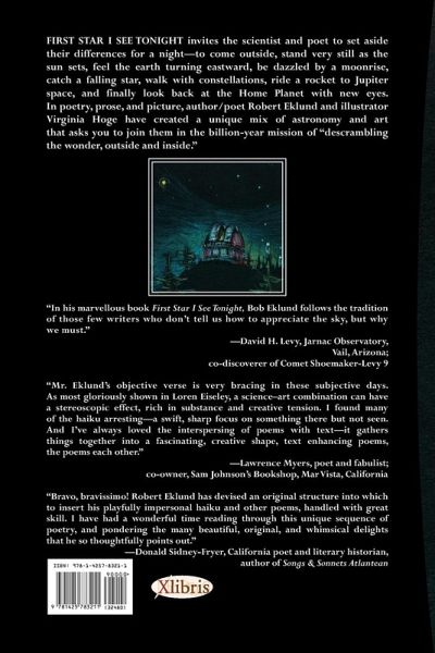 FIRST STAR I SEE TONIGHT is an intimate adventure with the sky and stars. This unique combination of prose, poetry, and art invites the reader to explore-in the company of an astronomer, poet, and artist-a night of wonder under the stars. The book can be thought of as an excursion into the earth's own shadow, from nightfall to dawn, including a liftoff into outer space and a perspective on the delights of our home planet. It is structured in seven chaptrs: * TWILIGHT ZONE, a time when our perceptions shift and we become aware of a wider universe. * MOONGLOW. Through all its phases, our little sister-planet, the moon, is a constant source of wonder. * DEEP SKY. When the moon sets, the sky darkens and deepens, and countless new objects come into view. * ORION AND FRIENDS. Constellations help us make friends with the stars. * REACHING OUT. In our time we have truly begun to reach for the stars. * THE HOME PLANET. From space, we look back on our earth and see, with more discerning eyes, its times, seasons, lights, shadows, and colors. * GOOD NIGHT. Finally, even astronomers must go to bed. Bridging the gulf that so often separates the sciences from the arts and humanities, FIRST STAR I SEE TONIGHT shows how the astrophysicist's space and the poet/artist's sky can be understood and appreciated at one and the same time. It is written for young and old readers alike, but always for the young in heart. Author/poet Robert Eklund and illustrator/designer Virginia Hoge invite you to come along with them on a. Billion-year mission: Descrambling the wonder Outside and inside.