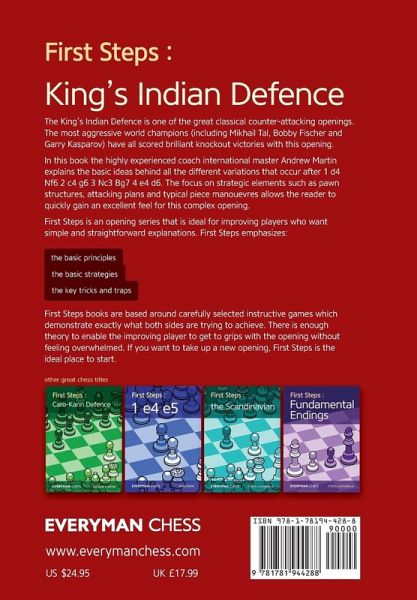 The King's Indian Defence is one of the great classical counter-attacking openings. The most aggressive world champions (including Mikhail Tal, Bobby Fischer and Garry Kasparov) have all scored brilliant knockout victories with this opening. In this book the highly experienced coach international master Andrew Martin explains the basic ideas behind all the different variations that occur after 1 d4 Nf6 2 c4 g6 3 Nc3 Bg7 4 e4 d6. The focus on strategic elements such as pawn structures, attacking plans and typical piece manouevres allows the reader to quickly gain an excellent feel for this complex opening. First Steps is an opening series that is ideal for improving players who want simple and straightforward explanations.