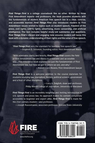 First Things First is a college coursebook like no other. Written by three First Amendment experts and professors, the book provides students with the fundamentals of modern American free speech law in a clear, concise, and accessible manner. First Things First also introduces readers to First Amendment issues related to topics such as student speech, freedom of the press, civil rights, LGBTQ rights, advertising, music censorship, and artificial intelligence. The text includes helpful study-aid summaries and questions. First Things First’s vibrant and engaging tone ensures readers will leave this book with a dynamic understanding of their rights and the value of free speech.
