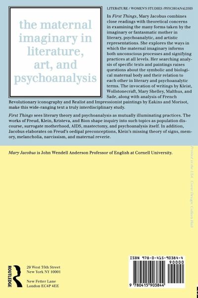 In First Things Mary Jacobus combines close readings with theoretical concerns in an examination of the many forms taken by the mythic or phantasmic mother in literary, psychoanalytic and artistic representations. She carefully explores the ways in which the maternal imaginary informs both unconscious processes and signifying practices at all levels. Her fierce analysis of specific texts and paintings raises questions about the the symbolic and biological maternal body and how they relate to each other in literary and psychoanalytic terms. The invocation of writings by Kleist, Wollstonecraft, Mary Shelley, Malthus and de Sade, along with analysis of French revolutionary iconography and Realist and Impressionist paintings by Eakins and Morisot, make this wide-ranging text a truly interdisciplinary study. First Things sees literary theory and psychoanalysis as mutually illuminating practices. The work of Freud, Klein, Kristeva and Bion shape an inquiry into such topics as population discourse, surrogate motherhood, AIDS, mastectomy and psychoanalysis itself. In addition, Jacobus elaborates on Freud's oedipal preconceptions, Klein's missing theory of signs, memory, melancholia, narcissism and maternal reverie.