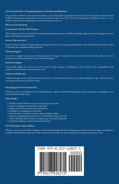 Your Essential Guide to Navigating Pregnancy and Embracing Fatherhood Are you about to embark on the journey of a lifetime as a first-time dad? Congratulations! But let's be honest, the road to fatherhood can be filled with questions, uncertainties, and a mix of emotions. That's where the "First-Time Dad Pregnancy Handbook" comes in - your ultimate companion for navigating this exciting adventure from day one. Why You Need This Book: Comprehensive Week-by-Week Guidance: Follow along each week as we break down what's happening with your partner and baby, providing insights into physical changes, emotional shifts, and developmental milestones. Practical Tips and Advice: Packed with practical tips, this guide helps you prepare for doctor visits, manage morning sickness, understand ultrasounds, and even plan for paternity leave and babyproofing your home. Emotional Support: Learn how to support your partner through postpartum changes, from physical recovery to emotional well-being. Discover ways to strengthen your bond and navigate the ups and downs together. Fatherhood Insights: Gain valuable insights into your new role, from the first diaper change to establishing a routine. Embrace your responsibilities with confidence and become the rock your family needs. Celebration of Milestones: Celebrate the big moments and small victories along the way. From planning the nursery to understanding labor signs, this book ensures you're prepared for every step of the journey. Encouraging and Conversational Style: Written in a warm, conversational tone, this guide feels like a supportive friend offering guidance and encouragement. It's engaging, easy to read, and full of relatable advice. What's Inside: Week-by-week breakdowns of your partner's pregnancy journey Tips for navigating morning sickness and fatigue Insights into ultrasounds and baby's development Strategies for managing stress and anxiety Practical advice on nutrition, healthy eating, and babyproofing Guidance on planning for paternity leave and building a support network Tips for bonding with your baby and supporting your partner postpartum Celebratory milestones and last-minute preparations Start Your Journey with Confidence: Whether you're a first-time dad or looking to refresh your knowledge, this book will equip you with the tools, knowledge, and confidence to embrace fatherhood with open arms. This is more than just a book; it's your roadmap to becoming the best dad you can be.