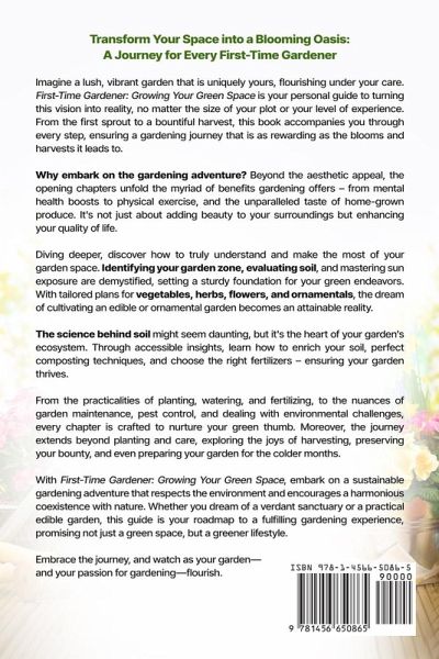 Transform Your Space into a Blooming Oasis: A Journey for Every First-Time Gardener Imagine a lush, vibrant garden that is uniquely yours, flourishing under your care. First-Time Gardener: Growing Your Green Space is your personal guide to turning this vision into reality, no matter the size of your plot or your level of experience. From the first sprout to a bountiful harvest, this book accompanies you through every step, ensuring a gardening journey that is as rewarding as the blooms and harvests it leads to. Why embark on the gardening adventure? Beyond the aesthetic appeal, the opening chapters unfold the myriad of benefits gardening offers - from mental health boosts to physical exercise, and the unparalleled taste of home-grown produce. It's not just about adding beauty to your surroundings but enhancing your quality of life. Diving deeper, discover how to truly understand and make the most of your garden space. Identifying your garden zone, evaluating soil, and mastering sun exposure are demystified, setting a sturdy foundation for your green endeavors. With tailored plans for vegetables, herbs, flowers, and ornamentals, the dream of cultivating an edible or ornamental garden becomes an attainable reality. The science behind soil might seem daunting, but it's the heart of your garden's ecosystem. Through accessible insights, learn how to enrich your soil, perfect composting techniques, and choose the right fertilizers - ensuring your garden thrives. From the practicalities of planting, watering, and fertilizing, to the nuances of garden maintenance, pest control, and dealing with environmental challenges, every chapter is crafted to nurture your green thumb. Moreover, the journey extends beyond planting and care, exploring the joys of harvesting, preserving your bounty, and even preparing your garden for the colder months. With First-Time Gardener: Growing Your Green Space, embark on a sustainable gardening adventure that respects the environment and encourages a harmonious coexistence with nature. Whether you dream of a verdant sanctuary or a practical edible garden, this guide is your roadmap to a fulfilling gardening experience, promising not just a green space, but a greener lifestyle. Embrace the journey, and watch as your garden-and your passion for gardening-flourish.