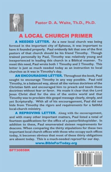 This book on First Timothy is from expository preaching sermons by Pastor D. A. Waite, Th.D., Ph.D. It brings to the mind of readers two things: (1)the meaning of the words in the verses and (2) the practical appliction of those words to the lives of both saved and lost people.