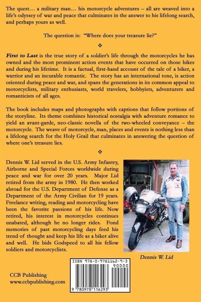 Book Description: First to Last is the true story of a soldier's life through the motorcycles he has owned and the most prominent action events that have occurred on those bikes and during his lifetime. It is a factual, first-hand account of the tale of a biker, a warrior and an incurable romantic. The story has an international tone, is action oriented during peace and war, and spans the generations in its common appeal to motorcyclists, military enthusiasts, world travelers, hobbyists, adventurers and romanticists of all ages. The book includes maps and photographs with captions that follow portions of the storyline. Its theme combines historical nostalgia with adventure romance to yield an avant-garde, neo-classic novella of the two-wheeled conveyance - the motorcycle. The weave of motorcycle, man, places and events is nothing less than a lifelong search for the Holy Grail that culminates in answering the question of where one's treasure lies. About the Author: Dennis W. Lid served in the U.S. Army Infantry, Airborne and Special Forces worldwide during peace and war for over 20 years. Major Lid retired from the army in 1980. He then worked abroad for the U.S. Department of Defense as a Department of the Army Civilian for 19 years. Freelance writing, reading and motorcycling have been the favorite passions of his life. Now retired, his interest in motorcycles continues unabated, although he no longer rides. Fond memories of past motorcycling days feed his trend of thought and keep his life as a biker alive and well. He bids Godspeed to all his fellow soldiers and motorcyclists.