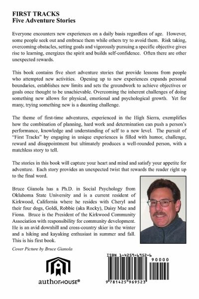Everyone encounters new experiences on a daily basis regardless of age. However, some people seek out and embrace them while others try to avoid them. Risk taking, overcoming obstacles, setting goals and vigorously pursuing a specific objective gives rise to learning, energizes the spirit and builds self-confidence. Often there are other unexpected rewards. This book contains five short adventure stories that provide lessons from people who attempted new activities. Opening up to new experiences expands personal boundaries, establishes new limits and sets the groundwork to achieve objectives or goals once thought to be unachievable. Overcoming the inherent challenges of doing something new allows for physical, emotional and psychological growth. Yet for many, trying something new is a daunting challenge. The theme of first-time adventures, experienced in the High Sierra, exemplifies how the combination of planning, hard work and determination can push a person's performance, knowledge and understanding of self to a new level. The pursuit of "First Tracks" by engaging in unique experiences is filled with humor, challenge, reward and disappointment but ultimately produces a well-rounded person, with a matchless story to tell. The stories in this book will capture your heart and mind and satisfy your appetite for adventure. Each story provides an unexpected twist that rewards the reader right up to the final word.