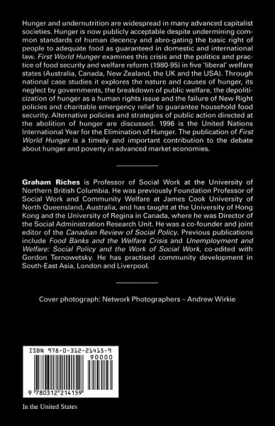 First World Hunger examines hunger and the politics of food security, and welfare reform (1980-95) in five 'liberal' welfare states (Australia, Canada, New Zealand, the UK and the USA). Through national case-studies it explores the depoliticization of hunger as a human rights issue and the failure of New Right policies and charitable emergency relief to guarantee household food security. The need for alternative integrated policies and the necessity of public action are considered essential if hunger is to be eliminated.