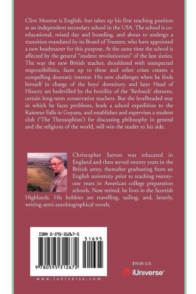 Clive Monroe is English, but takes up his first teaching position at an independent secondary school in the USA. The school is co-educational, mixed day and boarding, and about to undergo a transition mandated by its Board of Trustees, who have appointed a new headmaster for this purpose. At the same time the school is affected by the general “student revolutionism” of the late ’sixties. The way the new British teacher, shouldered with unexpected responsibilities, faces up to these and other crises creates a compelling dramatic interest. His new challenges when he finds himself in charge of the boys’ dormitory and later Head of History are bedevilled by the hostility of the ‘Redneck’ element, certain long-term conservative teachers. But the levelheaded way in which he faces problems, leads a school expedition to the Kaieteur Falls in Guyana, and establishes and supervises a student club (‘The Theosophists’) for discussing philosophy in general and the religions of the world, will win the reader to his side.
