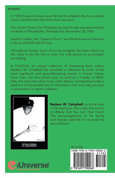 In 1925 Howard Johnson was the first to establish the mass-market menu. And thus the fast-food chain was born. The United States' first Thanksgiving Day Parade was presented by Gimbels in Philadelphia, Pennsylvania, November 25, 1920. Aretha Franklin, the "Queen of Soul," was the first woman inducted in Rock and Roll Hall of Fame. Throughout history, much of human progress has been driven by the need to be the first or even the only person to accomplish something. In First/Only, an unique collection of interesting facts, author Nedson W. Campbell has compiled a reference to some of the most significant and groundbreaking events in human history. From Cain, the first person ever to commit a murder, to BOX-USA, the only interactive music video station, Campbell provides a plethora of remarkable bits of information that may help you start a conversation or spark a debate.