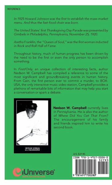 In 1925 Howard Johnson was the first to establish the mass-market menu. And thus the fast-food chain was born. The United States' first Thanksgiving Day Parade was presented by Gimbels in Philadelphia, Pennsylvania, November 25, 1920. Aretha Franklin, the "Queen of Soul," was the first woman inducted in Rock and Roll Hall of Fame. Throughout history, much of human progress has been driven by the need to be the first or even the only person to accomplish something. In First/Only, an unique collection of interesting facts, author Nedson W. Campbell has compiled a reference to some of the most significant and groundbreaking events in human history. From Cain, the first person ever to commit a murder, to BOX-USA, the only interactive music video station, Campbell provides a plethora of remarkable bits of information that may help you start a conversation or spark a debate.
