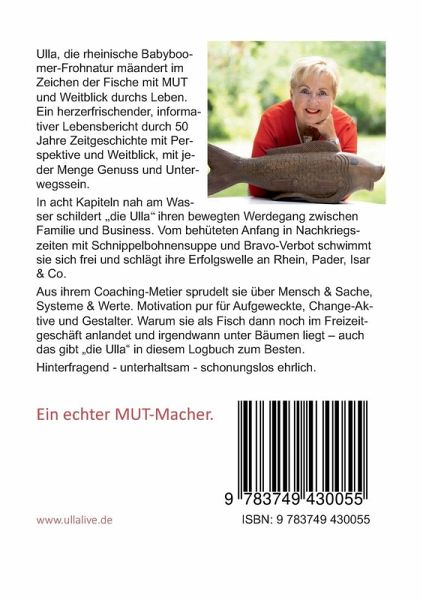 Ulla, die rheinische Babyboomer-Frohnatur Ulla mäandert im Zeichen der Fische mit MUT und Weitblick durchs Leben. Ein herzerfrischender, informativer Lebensbericht durch 50 Jahre Zeitgeschichte mit Perspektive und Weitblick, mit jeder Menge Genuss und Unterwegssein. In acht Kapiteln nah am Wasser schildert die Ulla, wie sie bald heißt, ihren bewegten Werdegang zwischen Familie und Business. Vom behüteten Anfang in Nachkriegszeiten mit Schnippelbohnensuppe und Bravo-Verbot schwimmt sie sich frei und schlägt ihre Erfolgswelle an Rhein, Pader, Isar & Co. Aus ihrem Coaching-Metier sprudelt sie über Mensch & Sache, Systeme & Werte, Motivation pur für Aufgeweckte, Change-Aktive und Gestalter. Warum sie als Fisch dann noch im Freizeitpark anlandet und irgendwann unter Bäumen liegt - auch das gibt die Ulla in diesem Logbuch zum Besten. Hinterfragend - unterhaltsam - schonungslos ehrlich. Ein echter MUT-Macher.