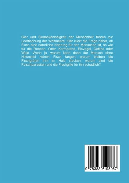 Gier und Gedankenlosigkeit der Menschheit führen zur Leerfischung der Weltmeere. Hier rückt die Frage näher, ob Fisch eine natürliche Nahrung für den Menschen ist, so wie für die Robben, Otter, Kormorane, Eisvögel, Defline oder Wale. Wenn ja, warum kann dann der Mensch ohne Hilfsmittel keinen Fisch fangen, warum bleiben die Fischgräten ihm im Hals stecken, warum sind die Fischparasiten und die Fischgifte für ihn schädlich?