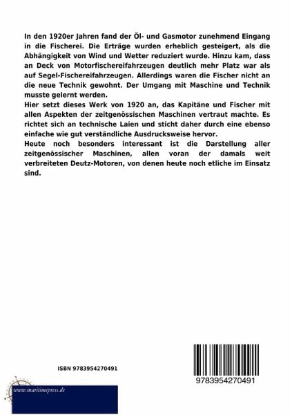In den 1920er Jahren fand der Öl- und Gasmotor zunehmend Eingang in die Fischerei. Die Erträge wurden erheblich gesteigert, als die Abhängigkeit von Wind und Wetter reduziert wurde. Hinzu kam, dass an Deck von Motorfischereifahrzeugen deutlich mehr Platz war als auf Segel-Fischereifahrzeugen. Allerdings waren die Fischer nicht an die neue Technik gewohnt. Der Umgang mit Maschine und Technik musste gelernt werden. Hier setzt dieses Werk von 1920 an, das Kapitäne und Fischer mit allen Aspekten der zeitgenössischen Maschinen vertraut machte. Es richtet sich an technische Laien und sticht daher durch eine ebenso einfache wie gut verständliche Ausdrucksweise hervor. Heute noch besonders interessant ist die Darstellung aller zeitgenössischer Maschinen, allen voran der damals weit verbreiteten Deutz-Motoren, von denen heute noch etliche im Einsatz sind.