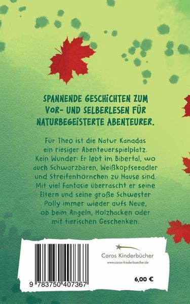 Spannende Geschichten zum Vor- und Selberlesen für naturbegeisterte Abenteurer.Für Theo ist die Natur Kanadas ein riesiger Abenteuerspielplatz. Kein Wunder: Er lebt im Bibertal, wo auch Schwarzbären, Weißkopfseeadler und Streifenhörnchen zu Hause sind. Mit viel Fantasie überrascht er seine Eltern und seine große Schwester Polly immer wieder aufs Neue, ob beim Angeln, Holzhacken oder mit tierischen Geschenken.