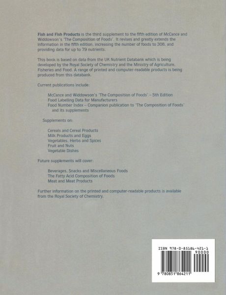 This supplement to McCance and Widdowson's The Composition of Foods 5th Edition presents in-depth information on the nutrient content of fish, crustacea, molluscs, fish products and fish dishes available in the UK. All previously published data have been updated and revised, and Fish and Fish Products now provides composition values for 308 foods, over 200 of which have not been covered before. The new nutrient composition information includes extensive individual fatty acid data. The foods covered in Fish and Fish Products take account of increasingly popular varieties now eaten, such as fresh sardines, red mullet and monkfish; fish prepared by different cooking methods including grilling and steaming; fish eaten by ethnic communities; fish available from fish and chip shops; and the wide variety of fish products now available such as seafood cocktail and taramasalata. The data provided covers both raw and cooked fish, and the main tables cover 42 nutrients per food. Included are inorganics and trace elements, vitamins, total fatty acids and cholesterol. Supplementary tables cover individual fatty acids per 100 grams of food, individual sugars, vitamin E fractions, retinol fractions, taxonomic and alternative names. Fish and Fish Products is the authoritative reference source for nutritionists, dietitians and others interested in the nutritional composition of this food group. It is the only source of complete and up-to-date compositional data appropriate to the UK, much of which has never been published before. This supplement will also be of interest to those in other countries whose diet includes fish.