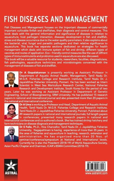 Fish Diseases and Management focuses on the important diseases of commercially important cultivable finfish and shellfishes, their diagnosis and control measures. This book deals with the general information and significance of diseases in relation to aquaculture, host pathogen interaction, diseases development in fish and shellfish, stress and disease occurrence due to the water quality parameters. It also explains about the bacterial, viral, fungal and parasitic pathogens and their relative significance to aquaculture. This book has separate sections dedicated on strategies for health management which deals with immune system of fish and shrimp, different types of vaccines and routes of application. Eco - friendly control measures like the use of diffrent types of immunostimulants and probiotics used in aquaculture are also discussed. This book will be a valuable resource for students, researchers, faculties, diagnosticians, fish pathologists, aquaculture technicians and microbiologists concerned with the management of diseases of fish and shellfish.