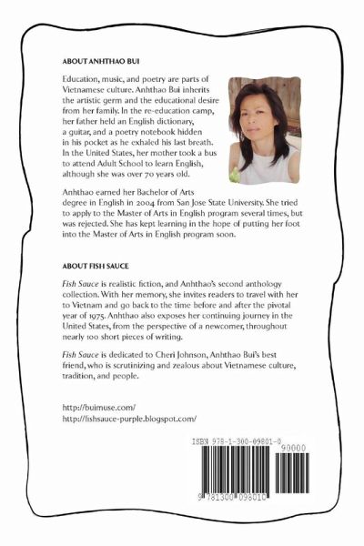 Fish Sauce is realistic fiction, and Anhthao's second anthology collection. With her memory, she invites readers to travel with her to Vietnam and go back to the time before and after the pivotal year of 1975. Anhthao also exposes her continuing journey in the United States, from the perspective of a newcomer, throughout nearly 100 short pieces of writing. Fish Sauce is dedicated to Cheri Johnson, Anhthao Bui's best friend, who is scrutinizing and zealous about Vietnamese culture, tradition, and people.