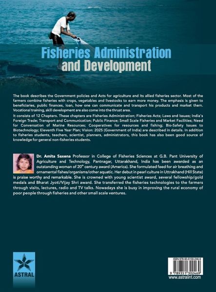 The book describes the Government policies and Acts for agriculture and its allied fisheries sector. Most of the farmers combine fisheries with crops, vegetables and livestocks to earn more money. The emphasis is given to beneficiaries, public finances, loan, how one can communicate and transport his products and market them. Vocational training, skill development are also come into the thrust area. It consists of 12 Chapters. These chapters are Fisheries Administration; Fisheries Acts; Laws and Issues; India's Foreign Trade; Transport and Communication; Public Finance; Small Scale Fisheries and Market Facilities; Need for Conversation of Marine Resources; Cooperatives for resources and fishing; Bio-Safety Issues to Biotechnology; Eleventh Five Year Plan; Vision: 2025 (Government of India) are described in details. In addition to fisheries students, teachers, scientist, planners, administrators, this book has also been good source of knowledge for general non-fisheries students.