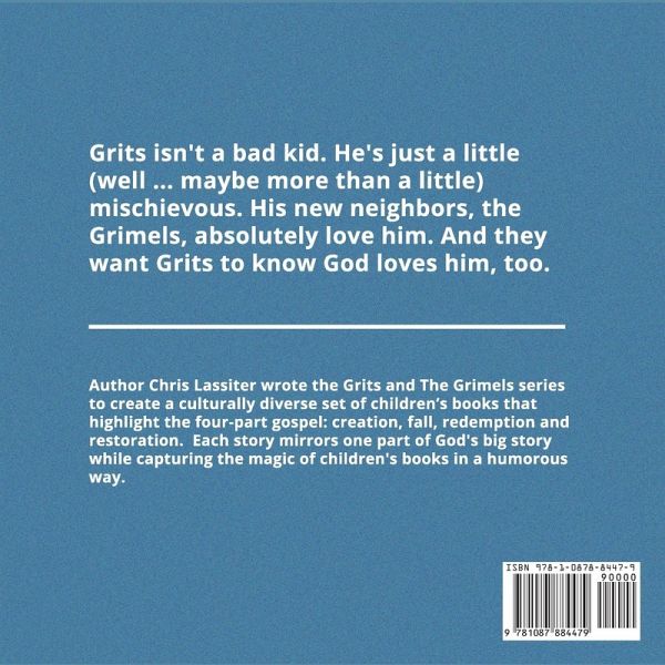 Grits isn't a bad kid. He's just a little (well ... maybe more than a little) mischievous. His new neighbors, the Grimels, absolutely love him. And they want Grits to know that God loves him, too. Author Chris Lassiter created the Grits and the Grimels series to create a culturally diverse set of books that highlights the four-part gospel - creation, fall, redemption and restoration - all while capturing the magic of children's books.