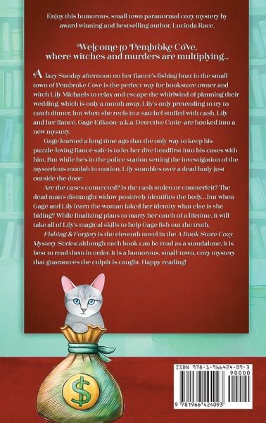 Enjoy this witty, small-town paranormal, cozy mystery by award-winning and bestselling author Lucinda Race. Welcome to Pembroke Cove, where witches and murders are multiplying... A lazy Sunday afternoon on her fiancé's fishing boat in the small town of Pembroke Cove is the perfect way for bookstore owner and witch Lily Michaels to relax and escape the whirlwind of planning their wedding, which is only a month away. Lily's only pretending to try to catch dinner, but when she reels in a satchel stuffed with cash, Lily and her fiancé, Gage Erikson-a.k.a. Detective Cutie-are hooked into a new mystery. Gage learned a long time ago that the only way to keep his puzzle-loving fiancé safe is to let her dive headfirst into his cases with him. But while he's in the police station setting the investigation of the mysterious moolah in motion, Lily stumbles over a dead body just outside the door. Are the cases connected? Is the cash stolen or counterfeit? The dead man's distraught widow positively identifies the body...but when Gage and Lily learn the woman faked her identity what else is she hiding? While finalizing plans to marry her catch of a lifetime, it will take all of Lily's magical skills to help Gage fish out the truth. Fishing & Forgery is the eleventh novel in the A Book Store Cozy Mystery Series; although each book can be read as a standalone, it is best to read them in order. It is a humorous, small-town, cozy mystery that guarantees the culprit is caught. Happy reading!