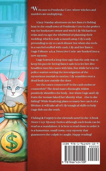 Enjoy this witty, small-town paranormal, cozy mystery by award-winning and bestselling author Lucinda Race. Welcome to Pembroke Cove, where witches and murders are multiplying... A lazy Sunday afternoon on her fiancé's fishing boat in the small town of Pembroke Cove is the perfect way for bookstore owner and witch Lily Michaels to relax and escape the whirlwind of planning their wedding, which is only a month away. Lily's only pretending to try to catch dinner, but when she reels in a satchel stuffed with cash, Lily and her fiancé, Gage Erikson-a.k.a. Detective Cutie-are hooked into a new mystery. Gage learned a long time ago that the only way to keep his puzzle-loving fiancé safe is to let her dive headfirst into his cases with him. But while he's in the police station setting the investigation of the mysterious moolah in motion, Lily stumbles over a dead body just outside the door. Are the cases connected? Is the cash stolen or counterfeit? The dead man's distraught widow positively identifies the body...but when Gage and Lily learn the woman faked her identity whatelse is she hiding? While finalizing plans to marry her catch of a lifetime, it will take all of Lily'smagical skills to help Gage fish out the truth. Fishing & Forgery is the eleventh novel in the A Book Store Cozy Mystery Series; although each book can be read as a standalone, it is best to read them in order. It is a humorous, small-town, cozy mystery that guarantees the culprit is caught. Happy reading!