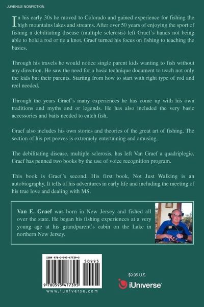 In his early 30s he moved to Colorado and gained experience for fishing the high mountains lakes and streams. After over 50 years of enjoying the sport of fishing a debilitating disease (multiple sclerosis) left Graef's hands not being able to hold a rod or tie a knot. Graef turned his focus on fishing to teaching the basics. Through his travels he would notice single parent kids wanting to fish without any direction. He saw the need for a basic technique document to teach not only the kids but their parents. Starting from how to start with right type of rod and reel needed. Through the years Graef's many experiences he has come up with his own traditions and myths and or legends. He has also included the very basic accessories and baits needed to catch fish. Graef also includes his own stories and theories of the great art of fishing. The section of his pet peeves is extremely entertaining and amusing. The debilitating disease, multiple sclerosis, has left Van Graef a quadriplegic. Graef has penned two books by the use of voice recognition program. This book is Graef's second. His first book, Not Just Walking is an autobiography. It tells of his adventures in early life and including the meeting of his true love and dealing with MS.