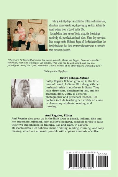 Fishing with Flip-flops is a collection of the most memorable, often time humorous stories, of growing up as street kids in the small Indiana town of Lowell in the '60s. Living behind their parents' florist shop, the five siblings survive by wit, pure luck, and each other. When they move to a little cottage on the Wildwood Bayou off the Kankakee River, the family finds out that there are more characters out in the world than they ever dreamed.