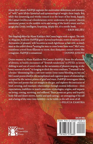 Linguistically acrobatic, FishWife interrogates dictionary definitions and the messy function of memory, reclaiming and redefining language to discover the self. This collection explores where and how embodiments of wifehood and identity overlap and entwine, alchemizing intuition into language and offering poetry as a mode of illumination. Traveling from sea to sky to earth, the speaker crosses literal and figurative borders of state lines and memory, challenging lexicography in a strange, liminal space of ghosts and grief. FishWife is a siren, a worker, a witch, a spinster, and a healer, grappling with identity, wifehood, marriage, and sometimes even fish.