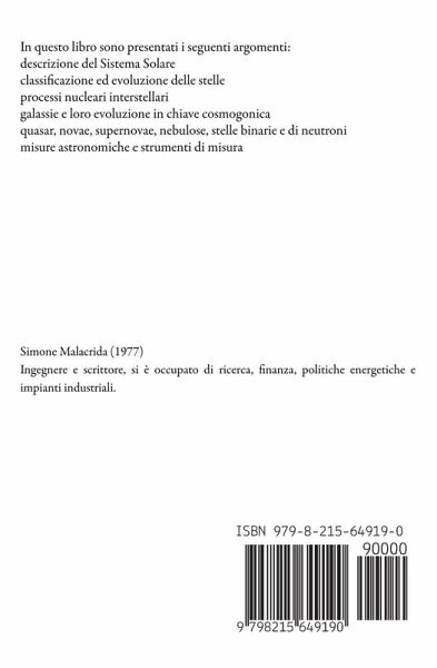 In questo libro sono presentati i seguenti argomenti: descrizione del Sistema Solare classificazione ed evoluzione delle stelle processi nucleari interstellari galassie e loro evoluzione in chiave cosmogonica quasar, novae, supernovae, nebulose, stelle binarie e di neutroni misure astronomiche e strumenti di misura
