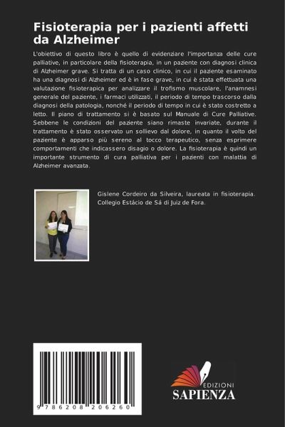 L'obiettivo di questo libro è quello di evidenziare l'importanza delle cure palliative, in particolare della fisioterapia, in un paziente con diagnosi clinica di Alzheimer grave. Si tratta di un caso clinico, in cui il paziente esaminato ha una diagnosi di Alzheimer ed è in fase grave, in cui è stata effettuata una valutazione fisioterapica per analizzare il trofismo muscolare, l'anamnesi generale del paziente, i farmaci utilizzati, il periodo di tempo trascorso dalla diagnosi della patologia, nonché il periodo di tempo in cui è stato costretto a letto. Il piano di trattamento si è basato sul Manuale di Cure Palliative. Sebbene le condizioni del paziente siano rimaste invariate, durante il trattamento è stato osservato un sollievo dal dolore, in quanto il volto del paziente è apparso più sereno al tocco terapeutico, senza esprimere comportamenti che indicassero disagio o dolore. La fisioterapia è quindi un importante strumento di cura palliativa per i pazienti con malattia di Alzheimer avanzata.