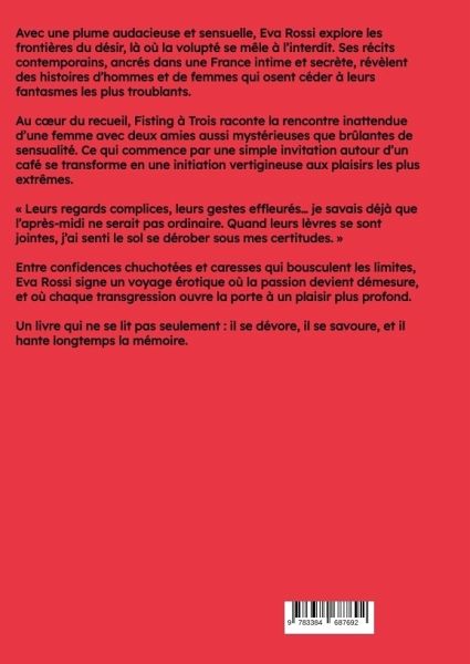 Avec une plume audacieuse et sensuelle, Eva Rossi explore les frontières du désir, là où la volupté se mêle à l'interdit. Ses récits contemporains, ancrés dans une France intime et secrète, révèlent des histoires d'hommes et de femmes qui osent céder à leurs fantasmes les plus troublants.Au coeur du recueil, Fisting à Trois raconte la rencontre inattendue d'une femme avec deux amies aussi mystérieuses que brûlantes de sensualité. Ce qui commence par une simple invitation autour d'un café se transforme en une initiation vertigineuse aux plaisirs les plus extrêmes.« Leurs regards complices, leurs gestes effleurés... je savais déjà que l'après-midi ne serait pas ordinaire. Quand leurs lèvres se sont jointes, j'ai senti le sol se dérober sous mes certitudes. »Entre confidences chuchotées et caresses qui bousculent les limites, Eva Rossi signe un voyage érotique où la passion devient démesure, et où chaque transgression ouvre la porte à un plaisir plus profond.Un livre qui ne se lit pas seulement : il se dévore, il se savoure, et il hante longtemps la mémoire.
