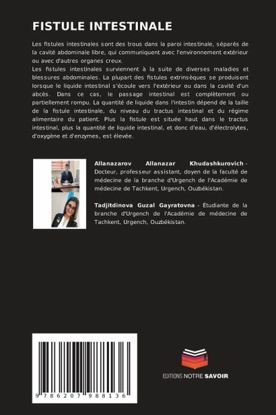 Les fistules intestinales sont des trous dans la paroi intestinale, séparés de la cavité abdominale libre, qui communiquent avec l'environnement extérieur ou avec d'autres organes creux.Les fistules intestinales surviennent à la suite de diverses maladies et blessures abdominales. La plupart des fistules extrinsèques se produisent lorsque le liquide intestinal s'écoule vers l'extérieur ou dans la cavité d'un abcès. Dans ce cas, le passage intestinal est complètement ou partiellement rompu. La quantité de liquide dans l'intestin dépend de la taille de la fistule intestinale, du niveau du tractus intestinal et du régime alimentaire du patient. Plus la fistule est située haut dans le tractus intestinal, plus la quantité de liquide intestinal, et donc d'eau, d'électrolytes, d'oxygène et d'enzymes, est élevée.
