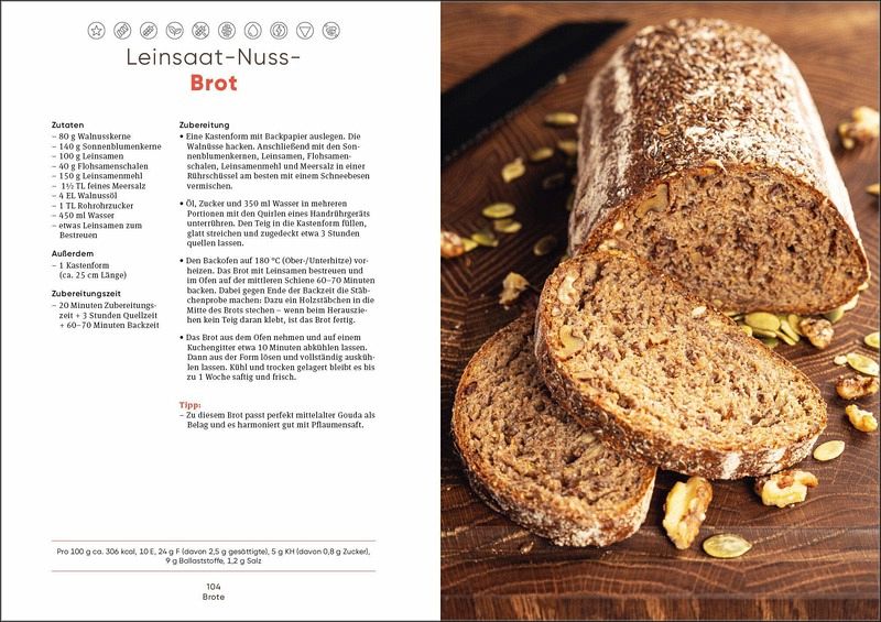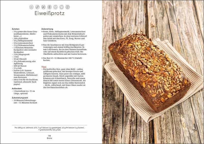 Es werden Backwaren für unterschiedliche Bedürfnisse vorgestellt: mit besonders vielen Ballaststoffen, mit hohem Proteingehalt, für einen gesunden Darm, FODMAP-arme, glutenfreie oder histaminarme Brote. Der Bio-Bäckermeister und Brotsommelier Johannes Dackweiler liefert dazu 60 genussvolle Rezepte, die jeder gut nachbacken kann: vom einfachen Vollkornbrot und Käse-Kräuter-Crackern über Gerstenbrötchen und Focaccia bis hin zu verschiedenen Sauerteigbroten.