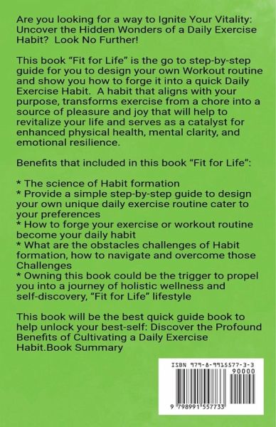 Are you looking for a way to Ignite Your Vitality: Uncover the Hidden Wonders of a Daily Exercise Habit? Look No Further! This book, "Fit for Life 5 Simple Steps Establish a Daily Workout Habit," is the go-to step-by-step guide for designing your personal workout routine and showing you how to establish a quick Daily Exercise Habit. A habit that aligns with your purpose transforms exercise from a chore into a source of pleasure and joy that will help revitalize your life and serve as a catalyst for enhanced physical health, mental clarity, and emotional resilience. Benefits that are included in this book:The science of Habit formation Provide a simple step-by-step guide to design your own unique daily exercise routine to cater to your preferences How to forge your exercise or workout routine become your daily habit What are the obstacles and challenges of Habit formation, how to navigate and overcome those challenges Owning this book could be the trigger to propel you into a journey of holistic wellness and self-discovery of a fit-for-life lifestyle This book will be the ultimate quick guide to help you unlock your best self: Discover the Profound Benefits of Cultivating a Daily Exercise Habit.
