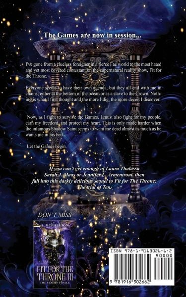 The Games are now in session... I've gone from a clueless foreigner in a fierce Fae world to the most hated and yet most coveted contender on the supernatural reality show, Fit for the Throne. Everyone seems to have their own agenda, but they all end with me in chains; either at the bottom of the ocean or as a slave to the Crown. Nothing is what I first thought and the more I dig, the more deceit I discover. Now, as I fight to survive the Games, I also have to fight for my people, earn my freedom, and protect my heart. The infamous Shadow Saint wants me dead almost as much as he wants me in his bed... Let the Games begin. If you can't get enough of Laura Thalassa, Sarah J. Maas or Jennifer L. Armentrout, then fall into this darkly delicious sequel to The Trial of Ten.
