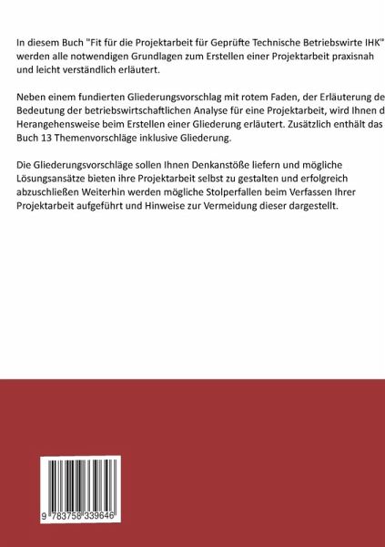 In diesem Buch "Fit für die Projektarbeit für Geprüfte Technische Betriebswirte IHK" werden alle notwendigen Grundlagen zum Erstellen einer Projektarbeit praxisnah und leicht verständlich erläutert. Neben einem fundierten Gliederungsvorschlag mit rotem Faden, der Erläuterung der Bedeutung der technischen und betriebswirtschaftlichen Analyse für eine Projektarbeit, wird Ihnen die Herangehensweise beim Erstellen einer Gliederung erläutert. Zusätzlich enthält das Buch 13 Themenvorschläge inklusive Gliederung. Die Gliederungsvorschläge sollen Ihnen Denkanstöße liefern und mögliche Lösungsansätze bieten ihre Projektarbeit selbst zu gestalten und erfolgreich abzuschließen Weiterhin werden mögliche Stolperfallen beim Verfassen Ihrer Projektarbeit aufgeführt und Hinweise zur Vermeidung dieser dargestellt.