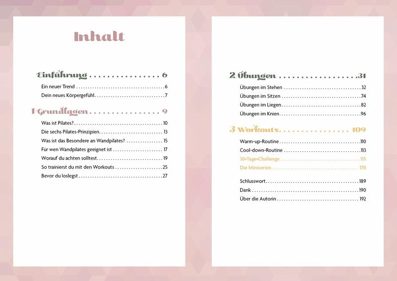 Trendsport Wall PilatesEntdecke Pilates neu: Trainerin Lisa Schweikhardt zeigt dir, wie du dein Pilates-Workout an die Wand verlagerst und es so noch effektiver gestaltest!Effektives GanzkörperworkoutLerne zunächst die Pilatesgrundlagen kennen. Diese sind wichtig, um die Übungen richtig und kontrolliert ausführen zu können. Anschließend werden dir mehr als 50 verschiedene Übungen an der Wand vorgestellt. Die Wand als Trainingsgerät bietet dir dabei die Möglichkeit, die Intensität der Übungen an dein eigenes Fitnesslevel anzupassen: - Anfängern gibt sie mehr Halt und Stabilität.- Fortgeschrittene können damit den Widerstand der einzelnen Übungen erhöhen, um noch gezielter die Muskeln zu kräftigen, die Beweglichkeit zu fördern und Dehnungen zu intensivieren.In 30 Tagen zu einem neuen KörpergefühlDas enthaltene 30-Tage-Programm bietet dir den perfekten Einstieg. Gegliedert in drei Phasen zu jeweils zehn Tagen startest du sanft in das Training, um dich an die Übungen und die täglicheBewegung zu gewöhnen. Mit jeder weiteren Stufe steigert sich die Intensität der Workouts, bis du zum Wandpilates-Profi wirst. Zusätzliche 5-Minuten-Einheiten stellen bestimmte Körperbereiche in den Fokus oder helfen, alltägliche Beschwerden wie Rücken- oder Nackenschmerzen zu lindern. Ab an die Wand für einen rundum fitten, straffen und gesunden Körper!