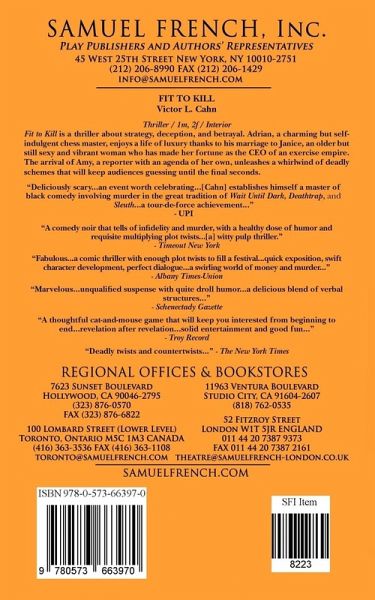 Thriller / 1m, 2f / Interior Fit to Kill is a thriller about strategy, deception, and betrayal. Adrian, a charming but self-indulgent chess master, enjoys a life of luxury thanks to his marriage to Janice, an older but still sexy and vibrant woman who has made her fortune as the CEO of an exercise empire. The arrival of Amy, a reporter with an agenda of her own, unleashes a whirlwind of deadly schemes that will keep audiences guessing until the final seconds. "Deliciously scary...an event wo