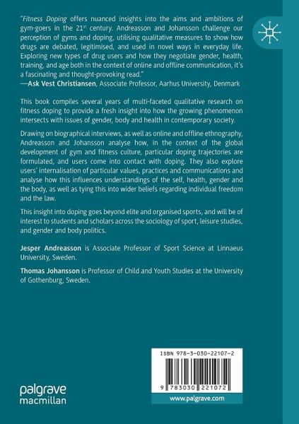 Drawing on biographical interviews, as well as online and offline ethnography, Andreasson and Johansson analyse how, in the context of the global development of gym and fitness culture, particular doping trajectories are formulated, and users come into contact with doping. They also explore users' internalisation of particular values, practices and communications and analyse how this influences understandings of the self, health, gender and the body, as well as tying this into wider beliefs regarding individual freedom and the law.