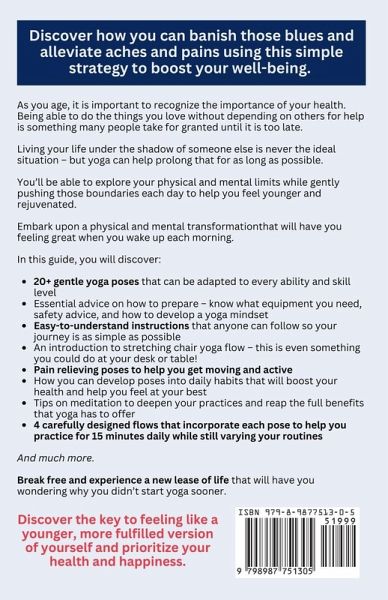Discover how you can banish those blues and alleviate aches and pains using this simple strategy to boost your well-being. As you age, it is important to recognize the importance of your health. Being able to do the things you love without depending on others for help is something many people take for granted until it is too late. Living your life under the shadow of someone else is never the ideal situation - but yoga can help prolong that for as long as possible. You'll be able to explore your physical and mental limits while gently pushing those boundaries each day to help you feel younger and rejuvenated. Embark upon a physical and mental transformation that will have you feeling great when you wake up each morning. In this guide, you will discover: 20+ gentle yoga poses that can be adapted to every ability and skill level Essential advice on how to prepare - know what equipment you need, safety advice, and how to develop a yoga mindset Easy-to-understand instructions that anyone can follow so your journey is as simple as possible An introduction to stretching chair yoga flow - this is even something you could do at your desk or table! Pain relieving poses to help you get moving and active How you can develop poses into daily habits that will boost your health and help you feel at your best Tips on meditation to deepen your practices and reap the full benefits that yoga has to offer 4 carefully designed flows that incorporate each pose to help you practice for 15 minutes daily while still varying your routines And much more. Break free and experience a new lease of life that will have you wondering why you didn't start yoga sooner. Discover the key to feeling like a younger, more fulfilled version of yourself and prioritize your health and happiness.