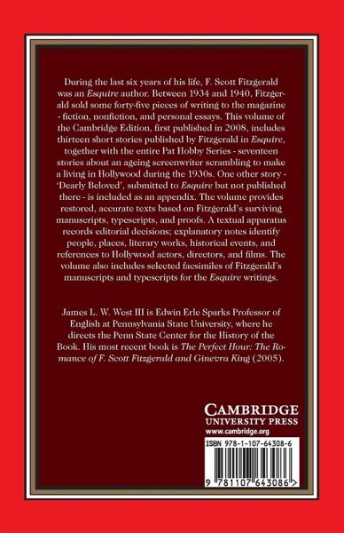 During the last six years of his life, F. Scott Fitzgerald was an Esquire author. Between 1934 and 1940, Fitzgerald sold some forty-five pieces of writing to the magazine - fiction, nonfiction, and personal essays. This volume of the Cambridge Edition includes thirteen short stories published by Fitzgerald in Esquire, together with the entire Pat Hobby Series -seventeen stories about an aging screenwriter scrambling to make a living in Hollywood during the 1930s. One other story - 'Dearly Beloved', submitted to Esquire but not published there - is included as an appendix. The volume provides restored, accurate texts based on Fitzgerald's surviving manuscripts, typescripts, and proofs. A textual apparatus records editorial decisions; explanatory notes identify people, places, literary works, historical events, and references to Hollywood actors, directors, and films. The volume also includes selected facsimiles of Fitzgerald's manuscripts and typescripts for the Esquire writings.
