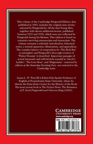 This volume of the Cambridge Fitzgerald Edition includes the original nine stories selected by Fitzgerald for All the Sad Young Men, together with eleven additional stories, published between 1925 and 1928, which were not collected by Fitzgerald during his lifetime. This edition is based on extensive surviving manuscripts and typescripts. The volume contains a scholarly introduction, historical notes, a textual apparatus, illustrations, and appendices. The complex history of composition for 'The Rich Boy' is untangled, and Fitzgerald's thorough revision of 'Winter Dreams' is described. Important passages of sexual innuendo and tabloid-style scandal in 'Jacob's Ladder', 'The Love Boat', and 'Magnetism' - removed by editors at the Saturday Evening Post - are restored to the Cambridge texts.