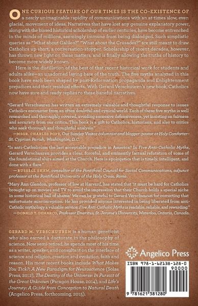 One curious feature of our times is the co-existence of a nearly unimaginable rapidity of communications with an at-times slow, even glacial, movement of ideas. Narratives that have lost any genuine explanatory power, along with the biased historical scholarship of earlier centuries, have become entrenched in the minds of millions, seemingly immune from being dislodged. Such simplistic queries as "What about Galileo?" "What about the Crusades?" are still meant to draw Catholics up short, a conversation-stopper. Scholarship of recent decades, however, has thrown new light on these matters, and is finally allowing the truths of history to become more widely known. Here is the distillation of the best of that recent historical work for students and adults alike--an unadorned laying bare of the truth. The five myths analyzed in this book have each been shaped by post-Reformation propaganda and Enlightenment prejudices and their residual effects. With Gerard Verschuuren's new book, Catholics now have sure and ready replies to these baneful narratives. "Gerard Verschuuren has written an extremely valuable and thoughtful response to issues Catholics encounter from an often doubtful and cynical world. Each of these five myths is well researched and thoroughly covered, avoiding excessive defensiveness, yet insisting on fairness and accuracy from our critics. This book is a gift to Catholics, historians, and also to critics who seek thorough and thoughtful analysis."--MSGR. CHARLES POPE, Our Sunday Visitor columnist and blogger; pastor at Holy Comforter-St. Cyprian Parish, Washington, DC. "Is anti-Catholicism the last acceptable prejudice in America? In Five Anti-Catholic Myths, Gerard Verschuuren provides a clear, forceful, and eminently factual refutation of some of the foundational slurs aimed at the Church. Here is apologetics that is timely, intelligent, and done with a flare."--RUSSELL SHAW, consultor of the Pontifical Council for Social Communications, adjunct professor at the Pontifical University of the Holy Cross, Rome. "Mary Ann Glendon, professor of law at Harvard, has stated that 'it must be hard for Catholics brought up on movies and TV to avoid the impression that their Church holds a special niche in some historical hall of shame.' We can be grateful to Gerard Verschuuren for correcting that unfortunate misconception. He has provided anyone interested in being liberated from anti-Catholic mythology a valuable service. Five Anti-Catholic Myths is readable, reliable, and rewarding."--DONALD T. DEMARCO, Professor Emeritus, St. Jerome's University, Waterloo, Ontario, Canada. GERARD M. VERSCHUUREN is a human geneticist who also earned a doctorate in the philosophy of science. Now semi-retired, he spends most of his time as a writer, speaker, and consultant on the interface of science and religion, creation and evolution, faith and reason. His most recent books include What Makes You Tick?: A New Paradigm for Neuroscience (Solas Press, 2012), The Destiny of the Universe: In Pursuit of the Great Unknown (Paragon House, 2014), and Life's Journey: A Guide from Conception to Natural Death (Angelico Press, forthcoming, 2015).