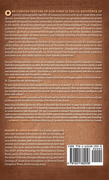 One curious feature of our times is the co-existence of a nearly unimaginable rapidity of communications with an at-times slow, even glacial, movement of ideas. Narratives that have lost any genuine explanatory power, along with the biased historical scholarship of earlier centuries, have become entrenched in the minds of millions, seemingly immune from being dislodged. Such simplistic queries as "What about Galileo?" "What about the Crusades?" are still meant to draw Catholics up short, a conversation-stopper. Scholarship of recent decades, however, has thrown new light on these matters, and is finally allowing the truths of history to become more widely known. Here is the distillation of the best of that recent historical work for students and adults alike--an unadorned laying bare of the truth. The five myths analyzed in this book have each been shaped by post-Reformation propaganda and Enlightenment prejudices and their residual effects. With Gerard Verschuuren's new book, Catholics now have sure and ready replies to these baneful narratives. "Gerard Verschuuren has written an extremely valuable and thoughtful response to issues Catholics encounter from an often doubtful and cynical world. Each of these five myths is well researched and thoroughly covered, avoiding excessive defensiveness, yet insisting on fairness and accuracy from our critics. This book is a gift to Catholics, historians, and also to critics who seek thorough and thoughtful analysis."--MSGR. CHARLES POPE, Our Sunday Visitor columnist and blogger; pastor at Holy Comforter-St. Cyprian Parish, Washington, DC. "Is anti-Catholicism the last acceptable prejudice in America? In Five Anti-Catholic Myths, Gerard Verschuuren provides a clear, forceful, and eminently factual refutation of some of the foundational slurs aimed at the Church. Here is apologetics that is timely, intelligent, and done with a flare."--RUSSELL SHAW, consultor of the Pontifical Council for Social Communications, adjunct professor at the Pontifical University of the Holy Cross, Rome. "Mary Ann Glendon, professor of law at Harvard, has stated that 'it must be hard for Catholics brought up on movies and TV to avoid the impression that their Church holds a special niche in some historical hall of shame.' We can be grateful to Gerard Verschuuren for correcting that unfortunate misconception. He has provided anyone interested in being liberated from anti-Catholic mythology a valuable service. Five Anti-Catholic Myths is readable, reliable, and rewarding."--DONALD T. DEMARCO, Professor Emeritus, St. Jerome's University, Waterloo, Ontario, Canada. GERARD M. VERSCHUUREN is a human geneticist who also earned a doctorate in the philosophy of science. Now semi-retired, he spends most of his time as a writer, speaker, and consultant on the interface of science and religion, creation and evolution, faith and reason. His most recent books include What Makes You Tick?: A New Paradigm for Neuroscience (Solas Press, 2012), The Destiny of the Universe: In Pursuit of the Great Unknown (Paragon House, 2014), and Life's Journey: A Guide from Conception to Natural Death (Angelico Press, forthcoming, 2015).
