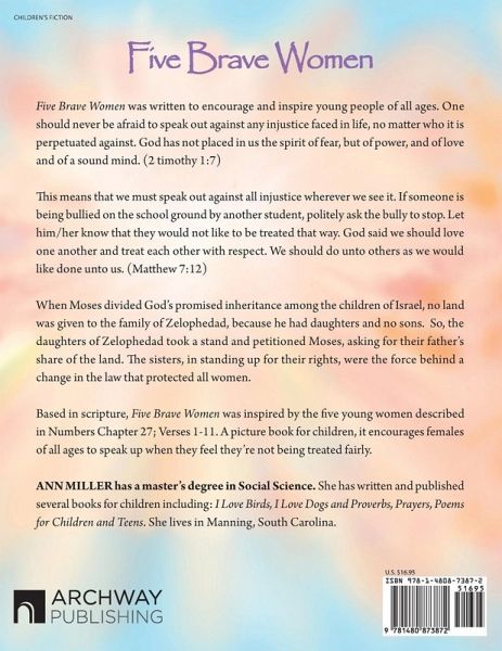 Five Brave Women was written to encourage and inspire young people of all ages. One should never be afraid to speak out against any injustice faced in life, no matter who it is perpetuated against. God has not placed in us the spirit of fear, but of power, and of love and of a sound mind. (2 timothy 1:7) This means that we must speak out against all injustice wherever we see it. If someone is being bullied on the school ground by another student, politely ask the bully to stop. Let him/her know that they would not like to be treated that way. God said we should love one another and treat each other with respect. We should do unto others as we would like done unto us. (Matthew 7:12) When Moses divided God's promised inheritance among the children of Israel, no land was given to the family of Zelophedad, because he had daughters and no sons. So, the daughters of Zelophedad took a stand and petitioned Moses, asking for their father's share of the land. The sisters, in standing up for their rights, were the force behind a change in the law that protected all women. Based in scripture, Five Brave Women was inspired by the five young women described in Numbers Chapter 27; Verses 1-11. A picture book for children, it encourages females of all ages to speak up when they feel they're not being treated fairly.