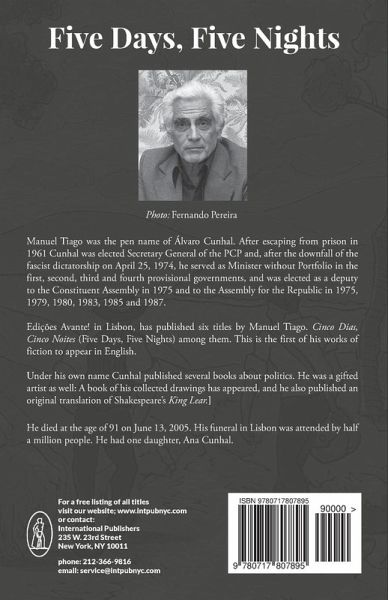 The Portuguese Communist Party is, proportionate to the size of the country’s population, one of the largest in the world, certainly in the capitalist world. It must have come as something of a surprise for Portuguese readers to learn that its longtime leader, Alvaro Cunhal, had made a sideline career for himself as a neorealist fiction writer. This book is the first to appear in English. International Publishers, renowned for its historic catalogue of publications of non-fiction, including Marxist theoretical studies, fiction, memoir and poetry, is proud to present this unusual novella as a long overdue expression of gratitude for Alvaro Cunhal’s self sacrificing leadership of the Portuguese Communists during most of the half-century of fascism in his land. Stylistically, Five Days, Five Nights approximates something of the 1940s and ’50s noir writers’ and filmmakers’ hyperrealist sensibilities, though any direct influence on the writer is not likely, for Cunhal wrote this book while imprisoned in Portugal in the 1950s. He was able to slip it past the censors, who saw little specifically political in it, merely the story of an emigrant escaping the country, a common occurrence at the time. Notably, there is no reference to the Party as such, though readers are welcome to infer its presence in the background. The manuscript of this novella was found in the archives of the Forte de Peniche, where Cunhal had been imprisoned. Cunhal had left it behind when he escaped on January 3, 1960, although he did take with him the manuscript to another, much longer and more specifically political novel, Até Amanhã, Camaradas. After the 25th of April 1974 Revolution that brought an end to fascism in Portugal, the military officers in charge of the fort returned the manuscript to Cunhal, and he published it in 1975 under the pseudonym Manuel Tiago, with a fictitious indication that it had been found in the "author’s" papers after his death (an explanation he also used for Até Amanhã, Camaradas). At the time the true authorship of these books was known only to the Party leadership. Only later in life, in 1994, did Cunhal acknowledge that he was "Manuel Tiago," pseudonymous author of several books (whose titles are noted in the biography of the author). Cunhal had obviously heard many stories of his comrades’ clandestine emigration across the border. Possibly, too, there may be some autobiographical content to the story given the author’s involvement in the Portuguese student movement in Lisbon in the very early years of António Salazar’s Estado Novo. Estado Novo or— "New State" was a version of fascism and a setting of the story in the early 1930s would seem probable. Furthermore, it seems to predate the Spanish Civil War (1936-39) and Francisco Franco’s subsequent fascist regime, if we are to accept the logic of an escape over the border from the oppressive Portugal to an untroubled Spain as described in the book. However, If we understand the story as existing outside of a specific time, involving archetypal situations, relationships and circumstances, then to that extent it achieves a certain universality, standing in for similar, parallel conditions almost anywhere in the world at any time. In the final analysis, Five Days, Five Nights surely was written to remind readers not only of the sacrifices made by fascism’s resisters, but of the loss of creativity and intelligence that Portugal suffered due to fascism's erosion of talented, hardworking citizens.